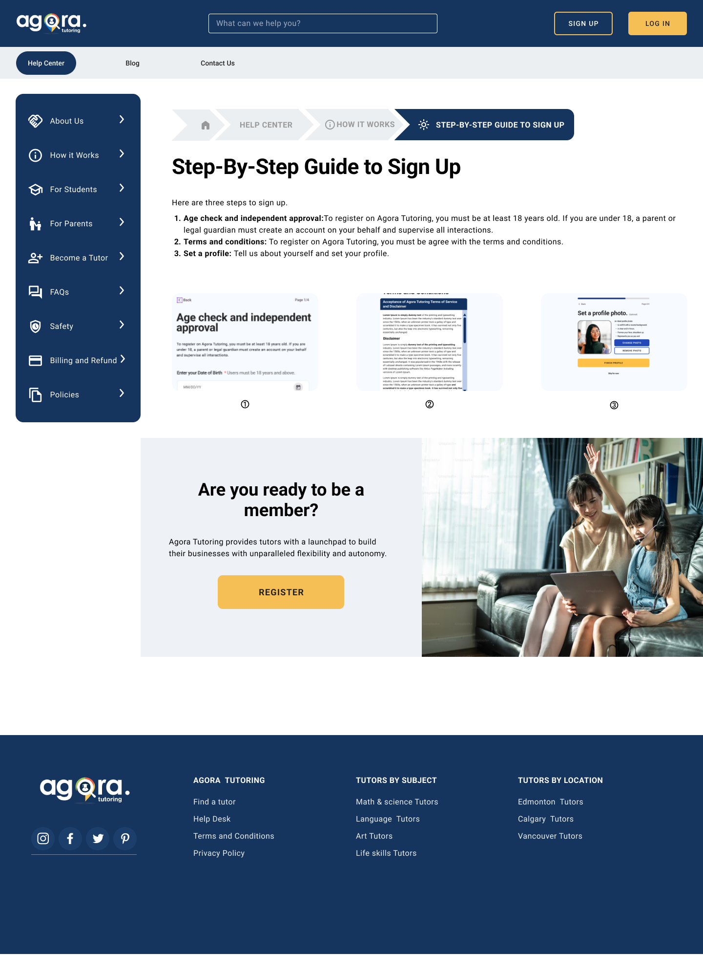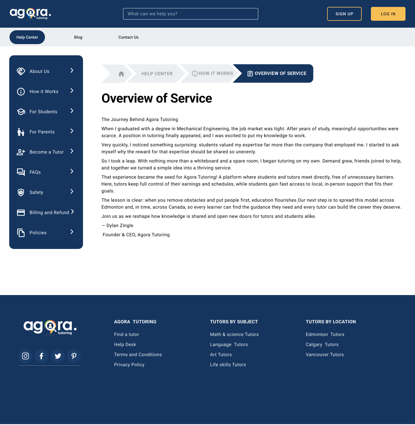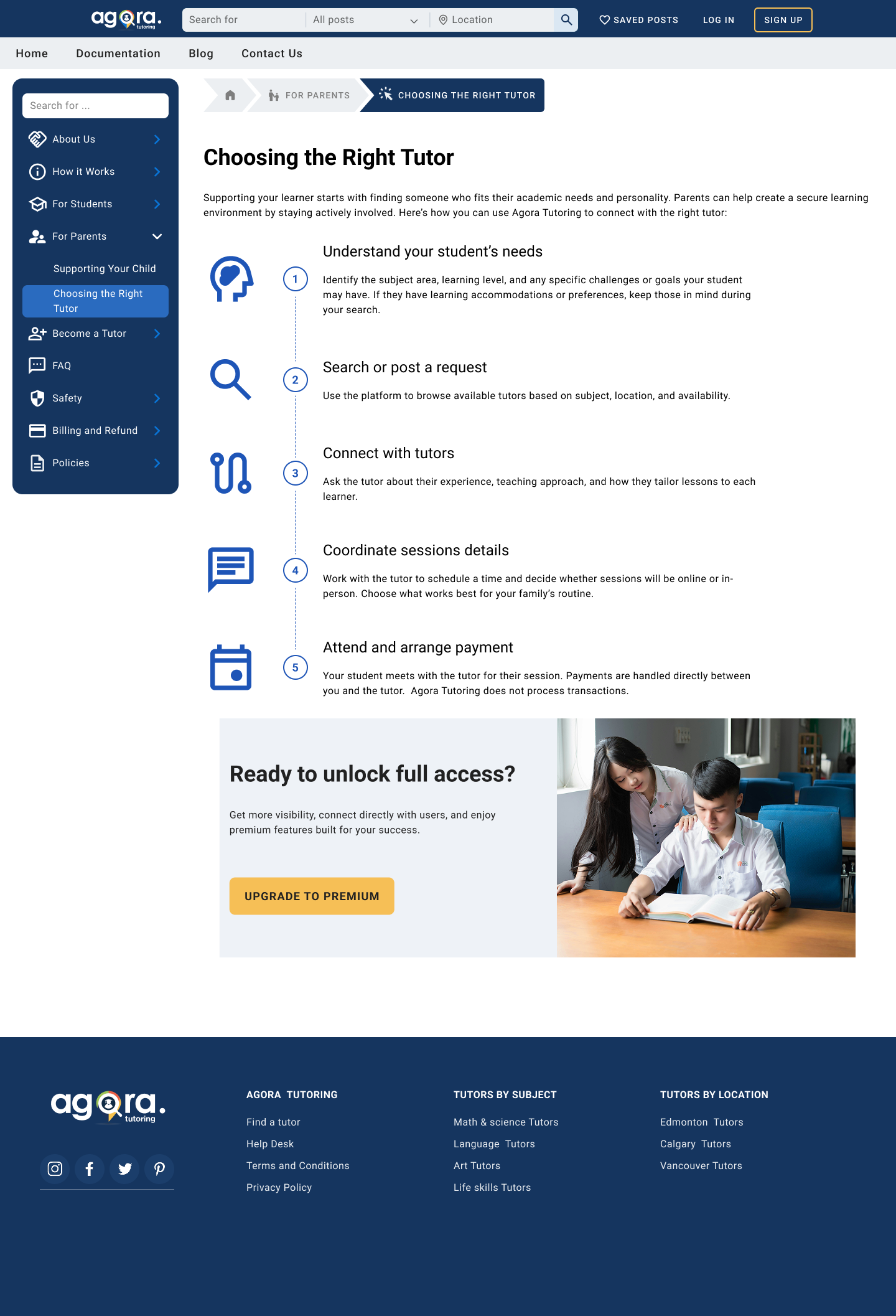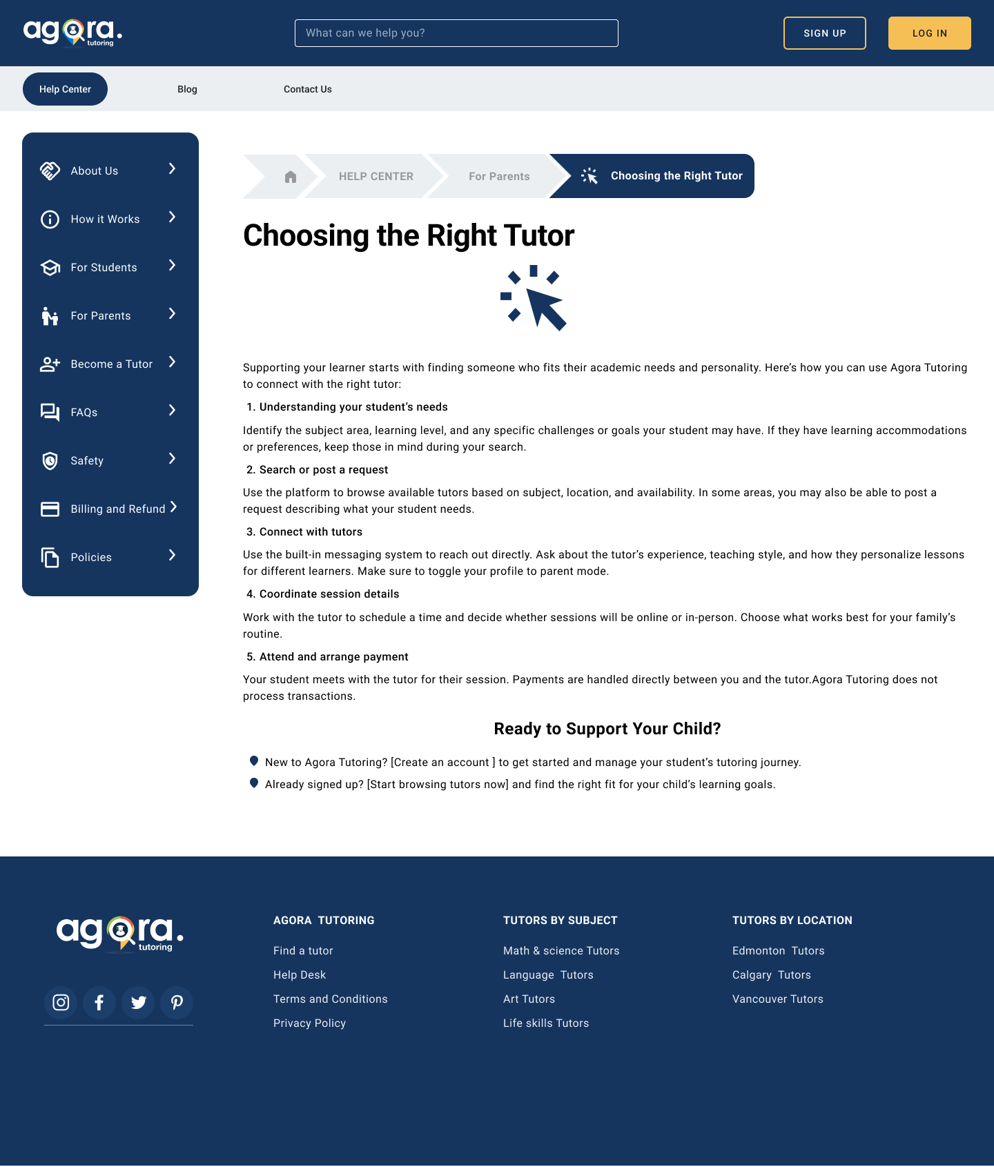 A complete redesign of the Help Center for Agora Tutoring—a Canada-based platform that connects students and tutors for in-person learning—focused on improving clarity, trust, and usability within strict layout and content constraints.