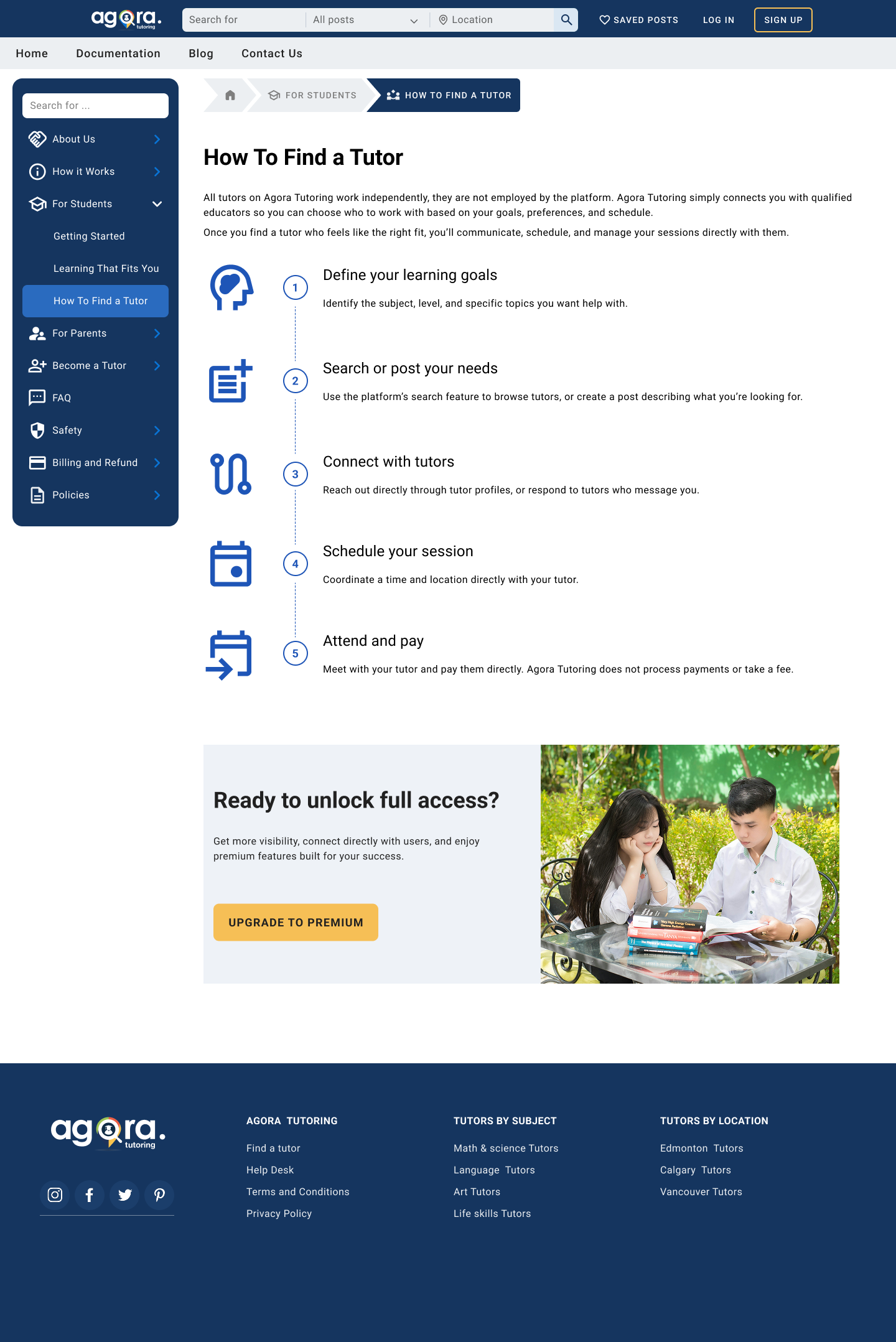 From Wyzant and italki: CTA integration within info pages drove conversions and was a tactic we sought to replicate on Agora’s Help pages to connect users with action steps like "Find a Tutor" or “Create a Post.”