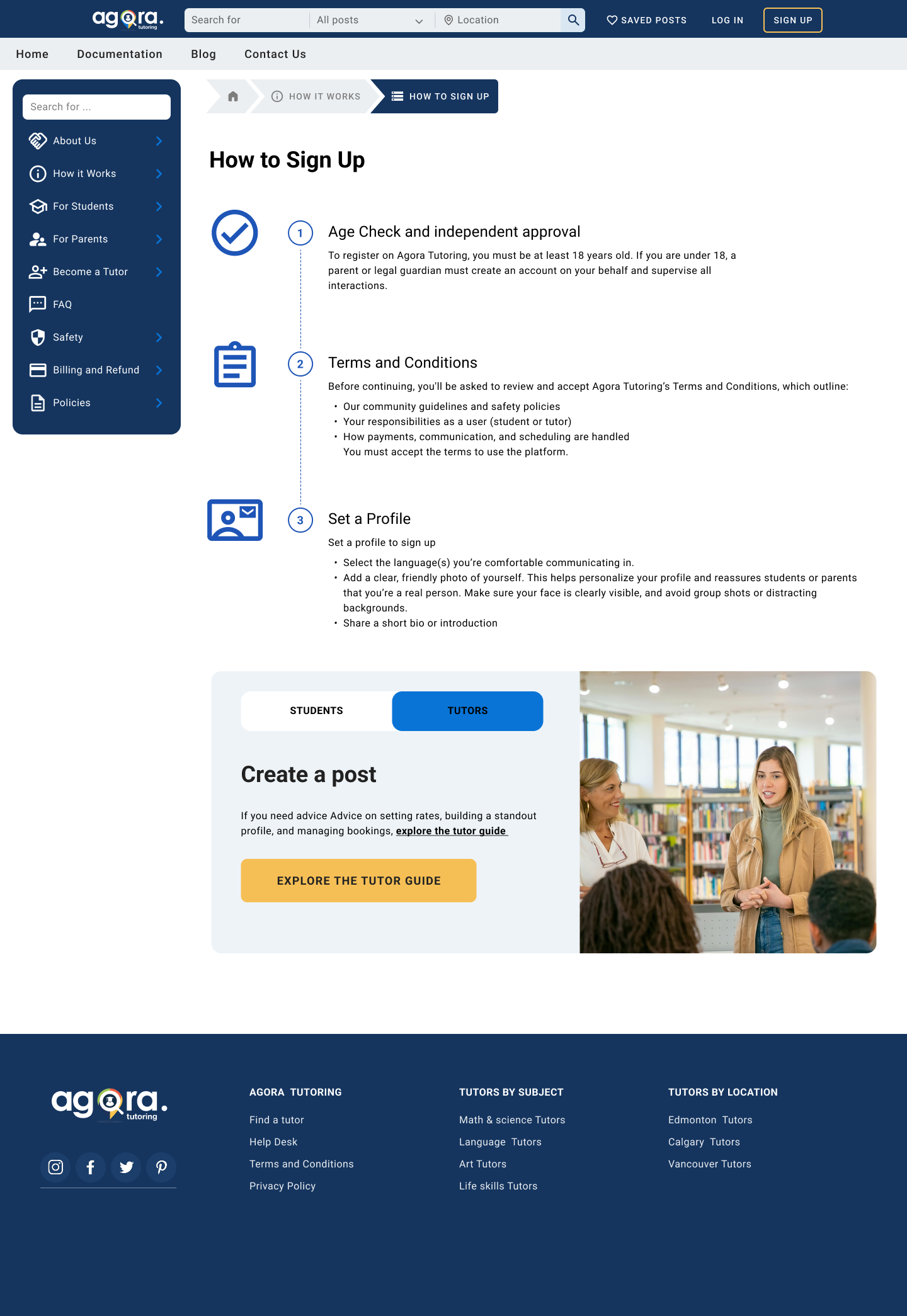 We ideated a “What Agora Is / Isn’t” section using icon-based callouts to clarify that Agora is a matchmaking platform, not a tutoring employer.