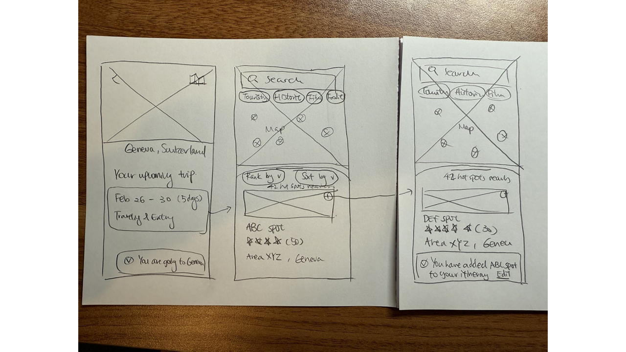 After selecting the most critical screen, I made the below three-panel board of the screen that comes before the critical screen and after the critical screen. It illustrates the process of (1) confirmation that an itinerary / trip is added, (2) searching, browsing, and selecting for photo spots to be included into the itinerary / trip, (3) confirmation that a photo spot is added to the user’s itinerary / trip and that the user can continue to search, browse, and select for other desired photo spots.