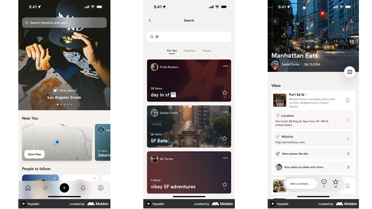 Hypelist (an app that allows users to create and share lists)’s features such as recommendations for nearby locations and thematic list, searching by keyword for location and theme recommendations, showing details of a user’s list
