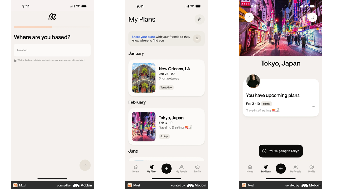 Mozi (a social networking app)’s features such as asking for where the user is based and travel plans curation: