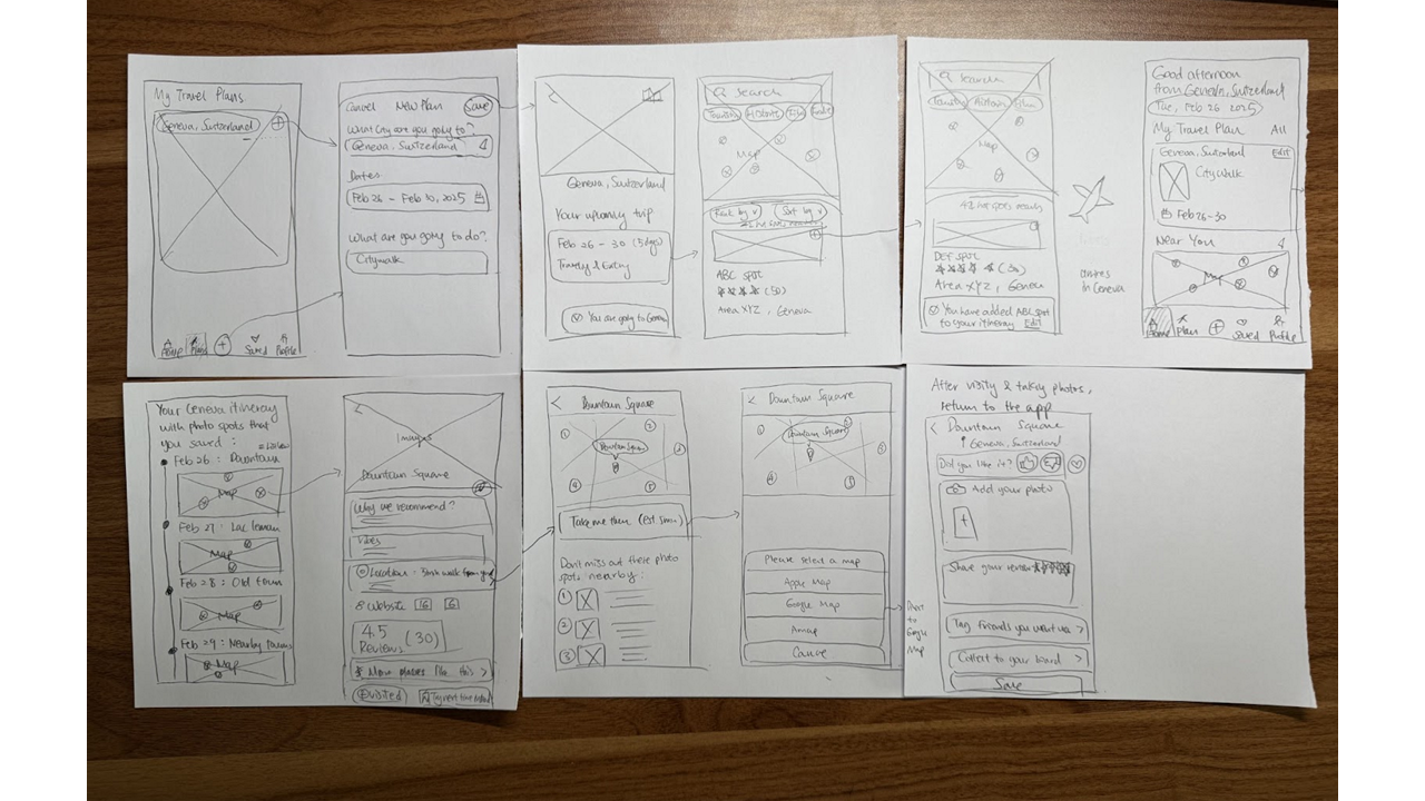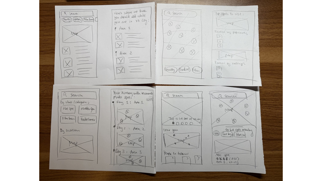 Using the Crazy 8s technique, I sketched multiple layout ideas for the key screen where users browse and add photo spots. Below is the Crazy 8s for the screen of selecting desired spots by filtering by themes or locations and browsing through photos: