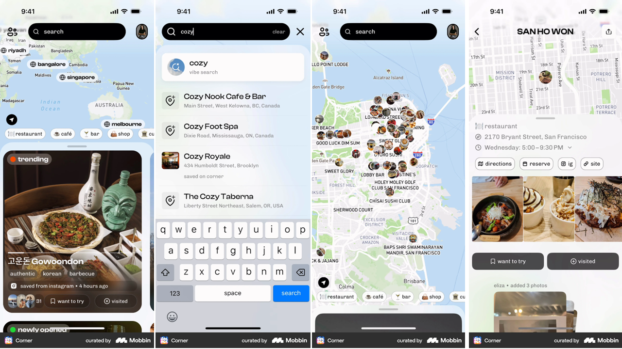 Corner (a personalized map app to share with friends)’s features such as finding locations on map, searching by vibes, looking for where friends’ went at certain cities:
